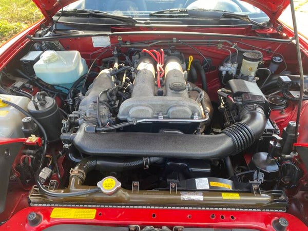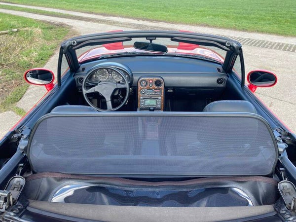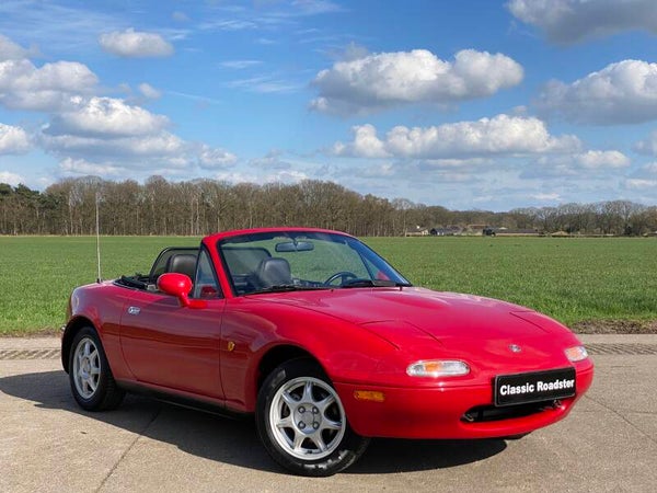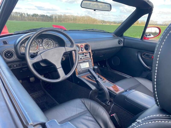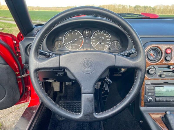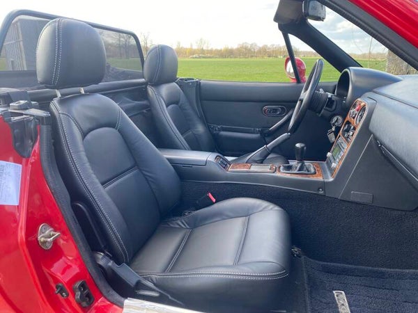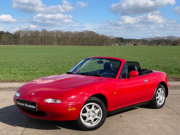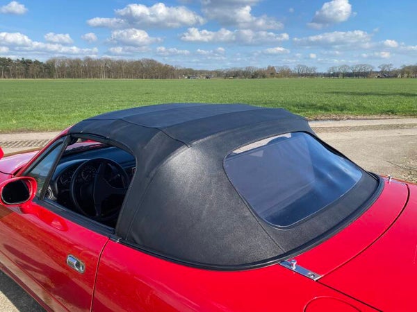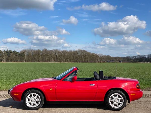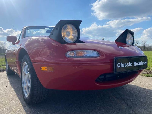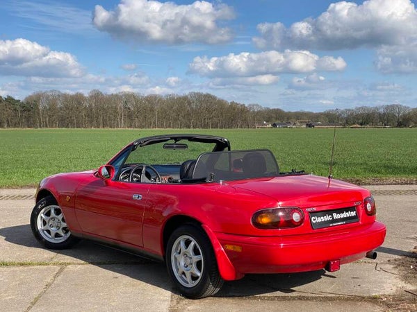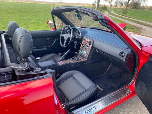 Een mooie, klassieke oer Mazda MX5 NA 1.8 te koop. In 1989 begon de productie van de best verkochte roadster ter wereld en in 1994 werd de MX5 1.8 geintroduceerd met 131pk. Deze auto is uitgevoerd in het Classic Red (de MX5 kleur!) met een zwart lederen interieur en een zwart vinyl/PVC cabriodak.