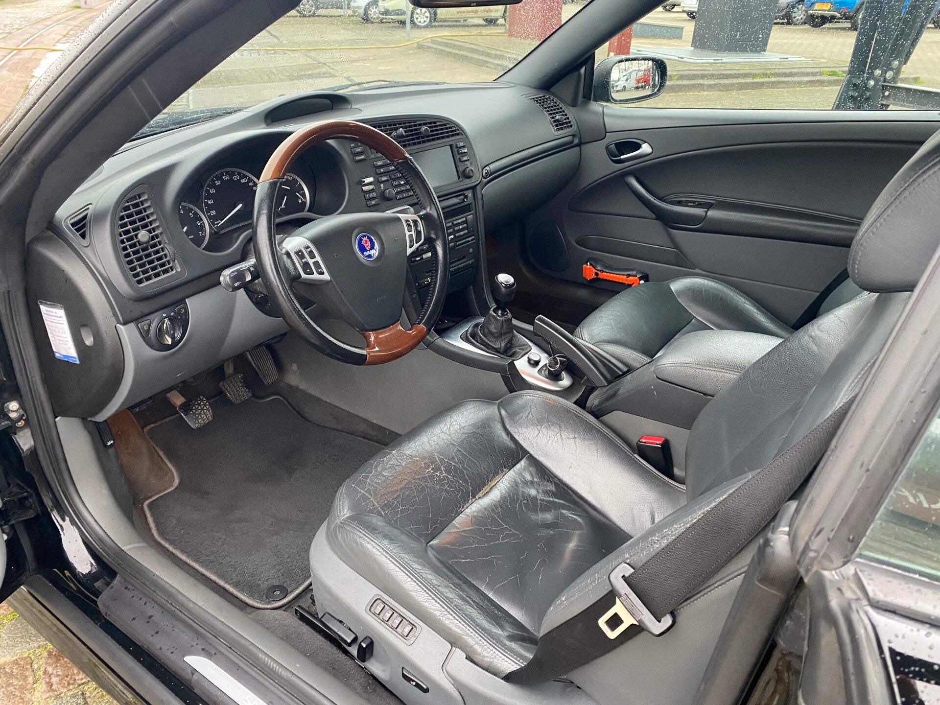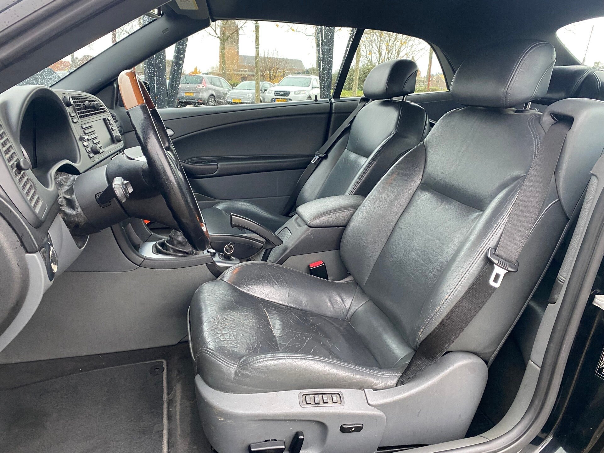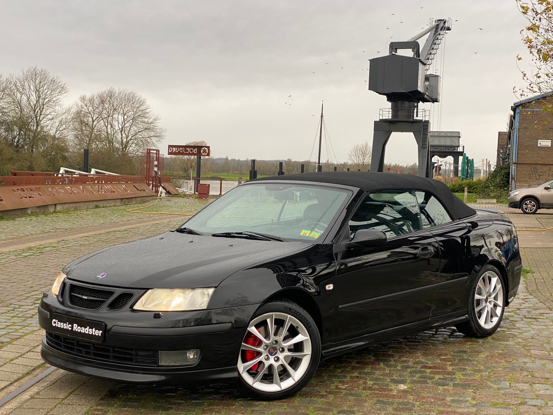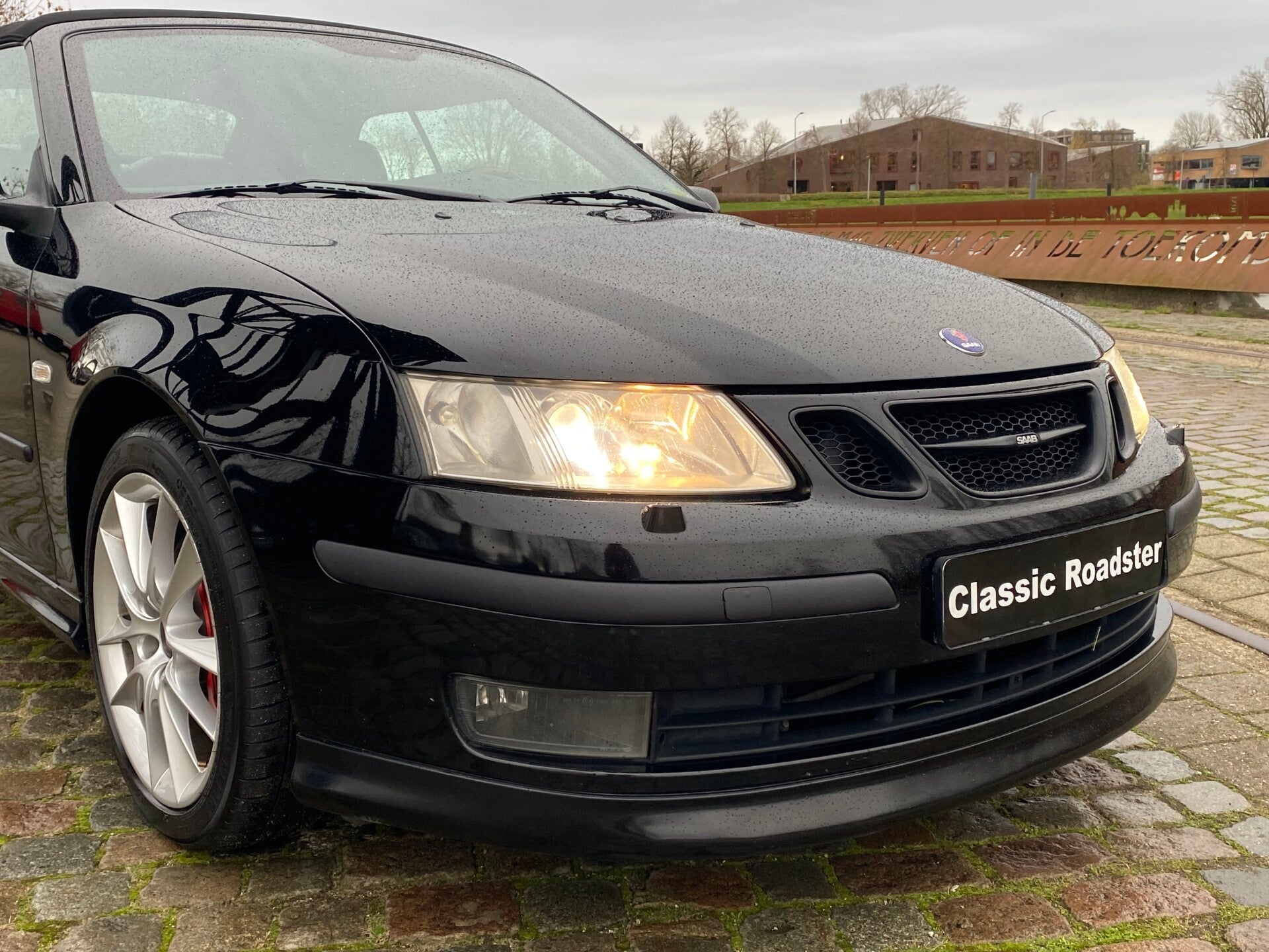 Een prachtige Saab 9-3 Cabriolet in de kleur ''Jet Black metallic'' uit 2004 met zwart lederen stoelen en een zwart interieur. In combinatie met een zwarte cabrioletkap met elektrische bediening. De Saab heeft een 1.998cc 4 cilindermotor gekoppeld aan een handgeschakelde zes versnellingsbak.