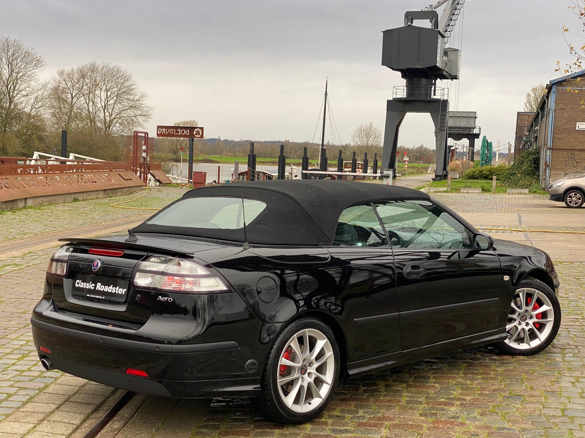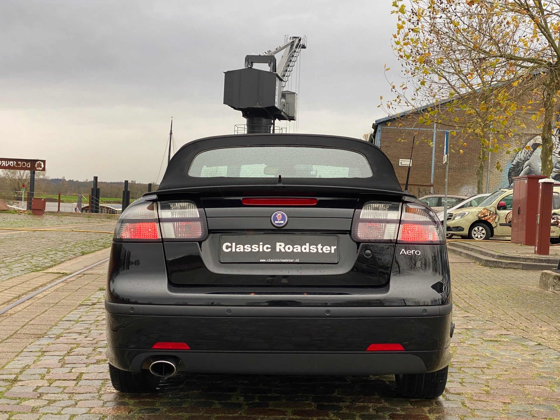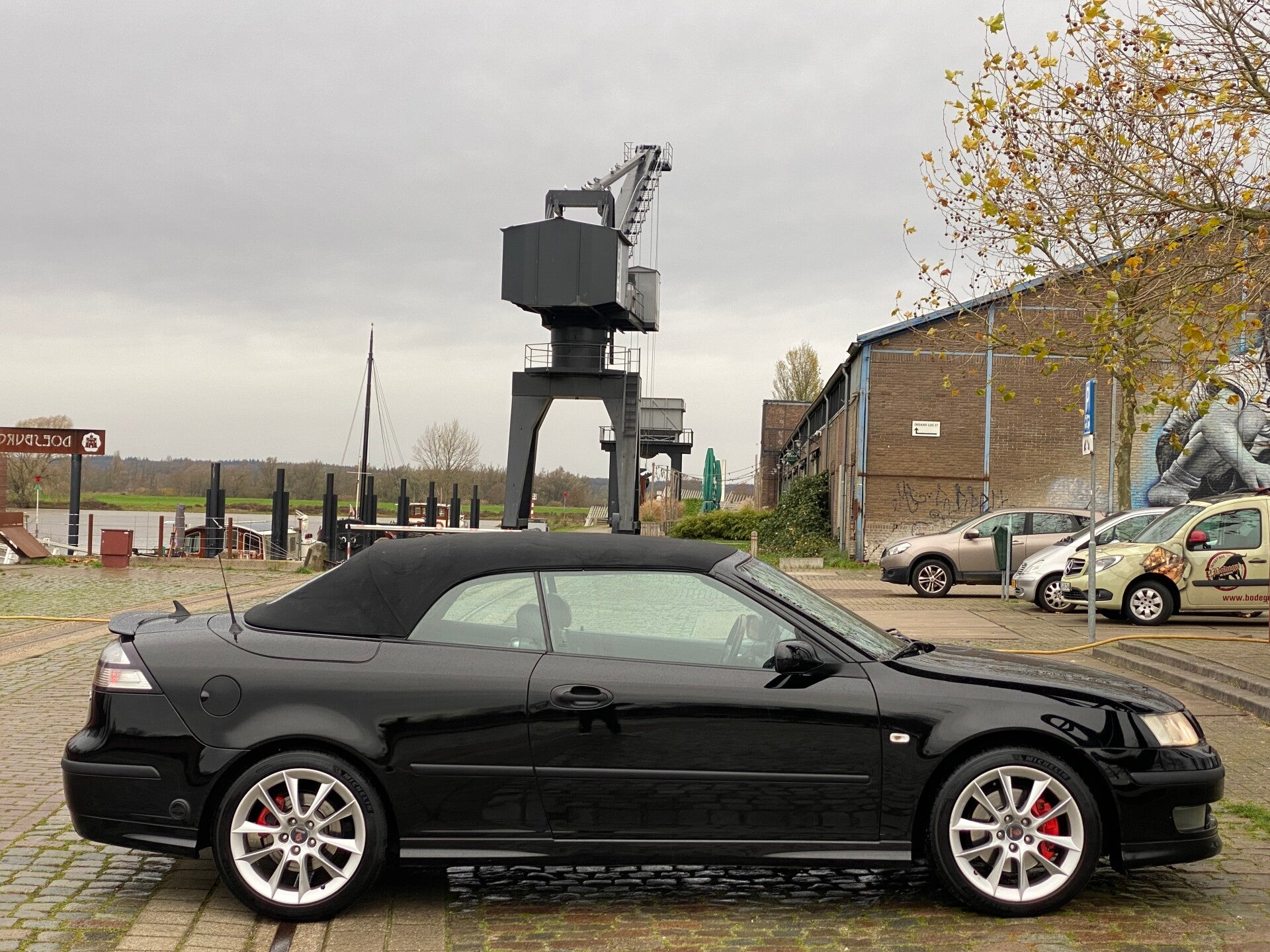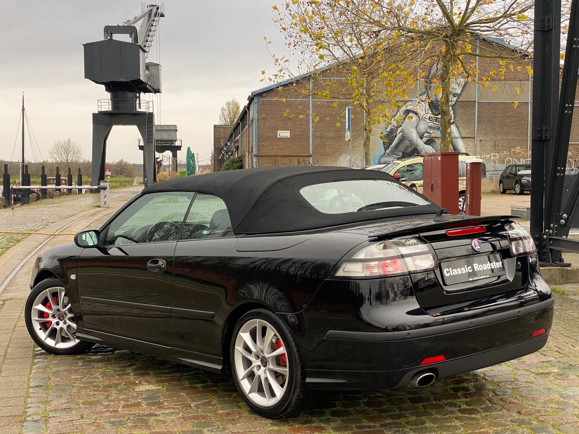 Een prachtige Saab 9-3 Cabriolet in de kleur ''Jet Black metallic'' uit 2004 met zwart lederen stoelen en een zwart interieur. In combinatie met een zwarte cabrioletkap met elektrische bediening. De Saab heeft een 1.998cc 4 cilindermotor gekoppeld aan een handgeschakelde zes versnellingsbak.
