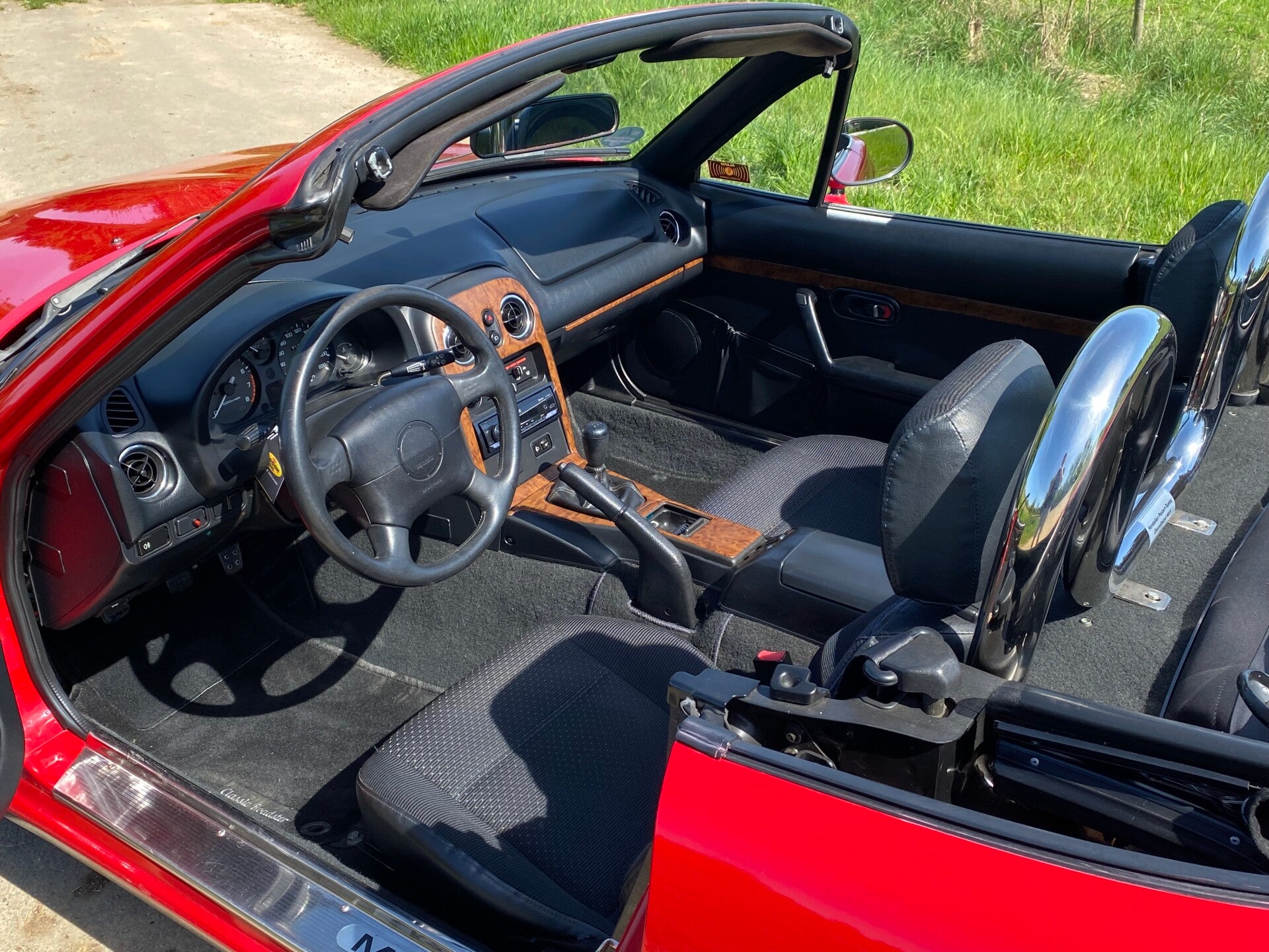 Een mooie, klassieke Mazda MX5 NA 1.6 te koop. In 1989 begon de productie van de best verkochte roadster ter wereld. Deze auto is uitgevoerd in het Classic Red (de MX5 kleur!) met een zwart stoffen interieur en een zwart stoffen cabriodak (welke recent vervangen is).
