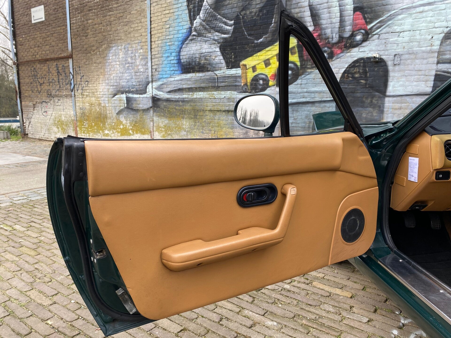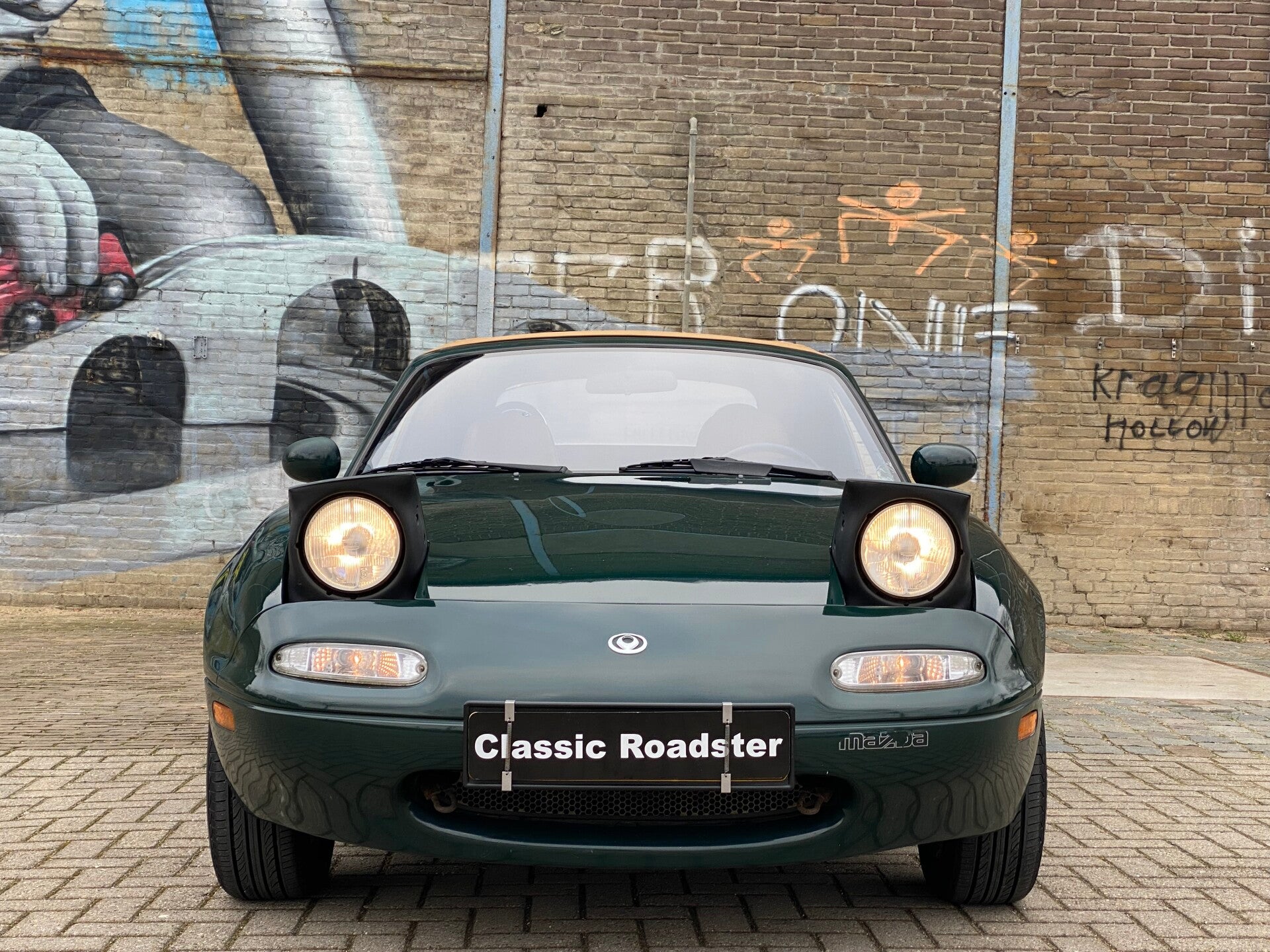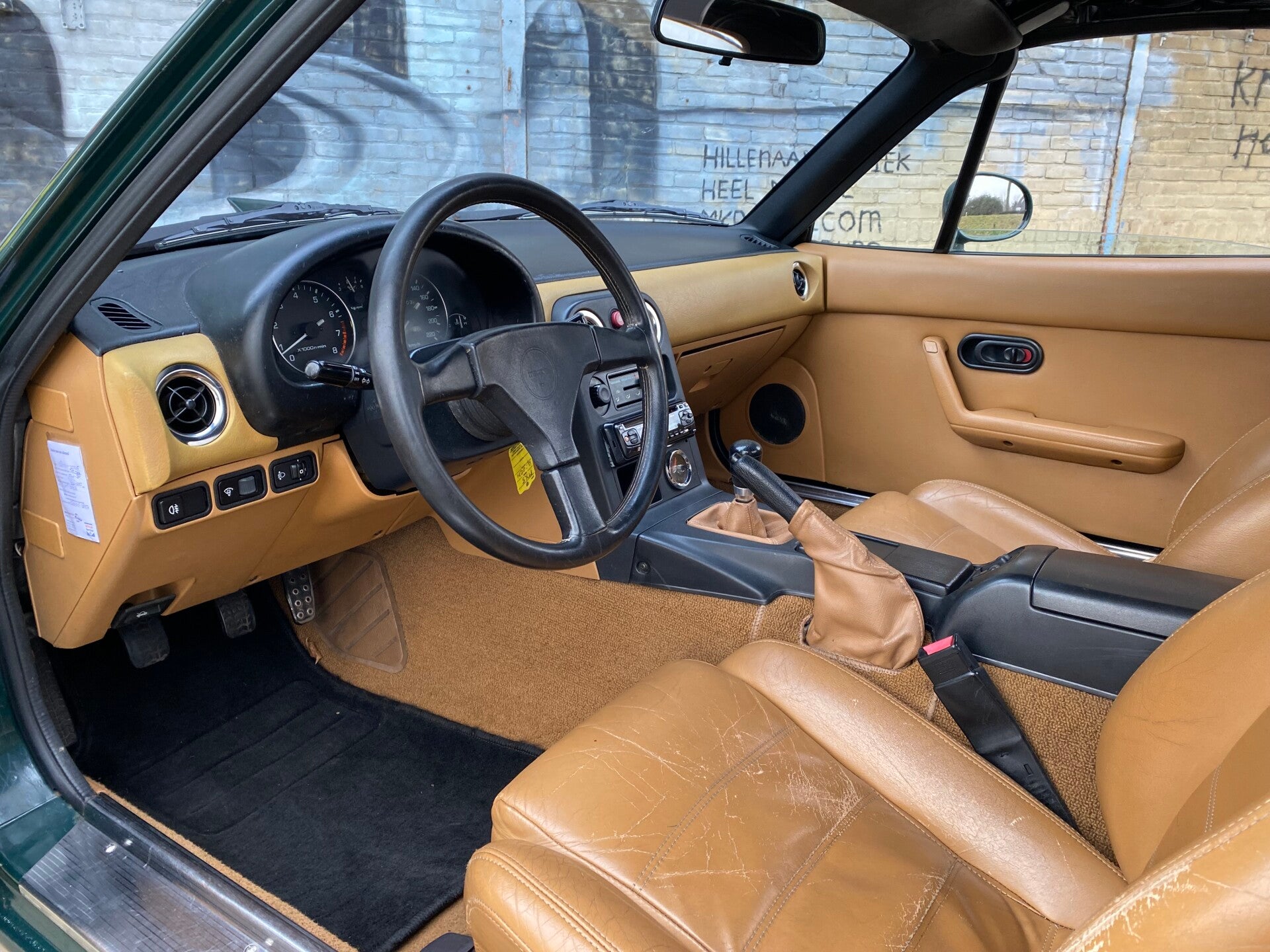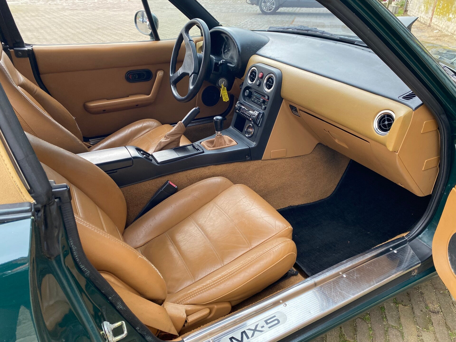 Een leuke, klassieke oer Mazda MX5 NA 1.6 te koop. In 1989 begon de productie van de best verkochte roadster ter wereld, de Mazda MX5. Deze auto is uitgevoerd in het ''British Racing Green'' met een Tan lederen interieur en een Tan vinyl/PVC cabriodak. Een van de meest gewilde uitvoeringen van de Mazda MX5 NA.