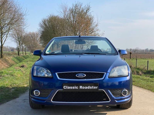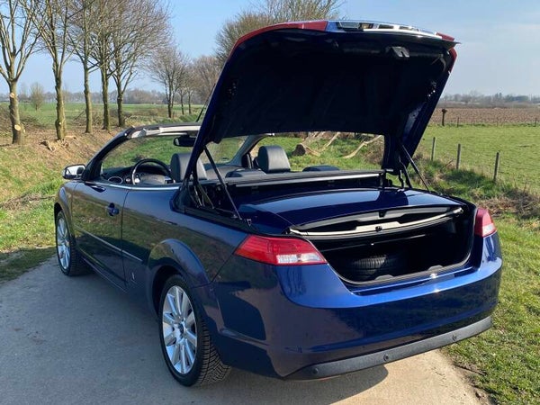Een mooie Ford Focus Coupe Cabriolet in het blauw metallic uit 2007 met een zwart lederen interieur. Een praktische cabriolet met een elektrische hardtop.