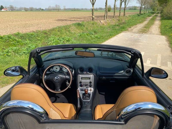 Deze Mazda MX5 NBFL is uitgevoerd met de smaakvolle kleurencombinatie van ''Brillantschwarz'' met een beige lederen interieur met stoelverwarming. De MX5 is voorzien van diverse luxe aan boord zoals airconditioning, centrale vergrendeling, stoelverwarming een notenhouten stuur enzovoorts.