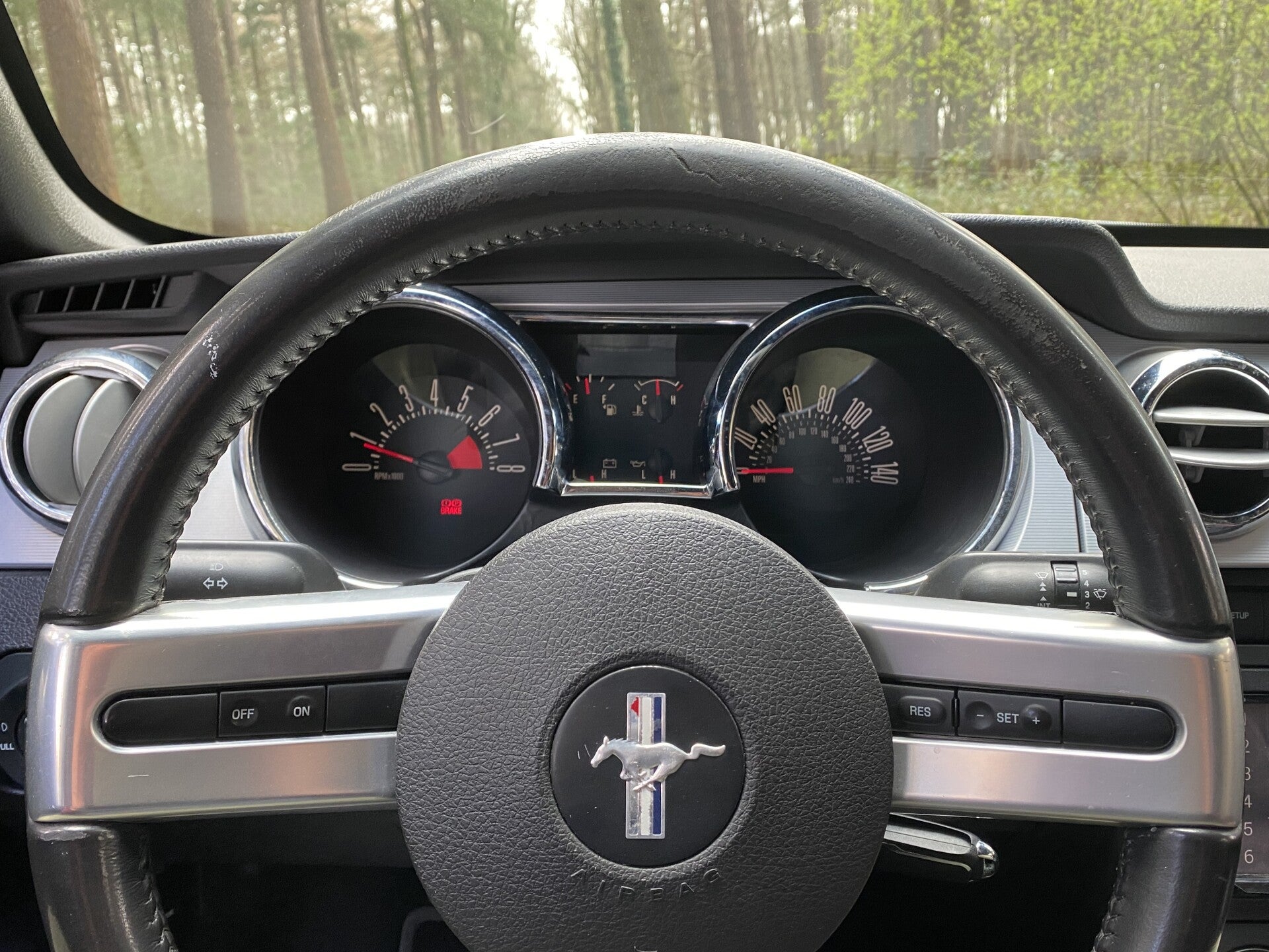 Deze zilvergrijze Mustang is vorig jaar geimporteerd uit Duitsland en is origineel afkomstig uit de USA. De teller is zowel in kilometers als in mijlen af te lezen.