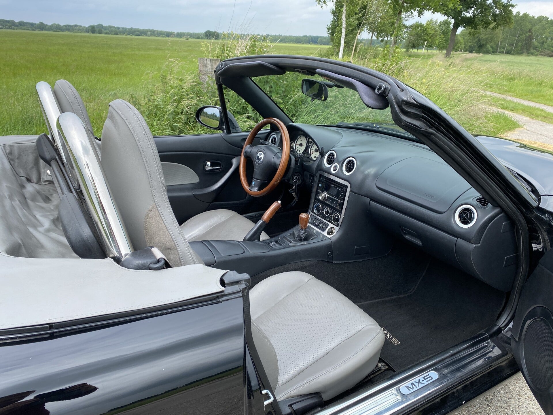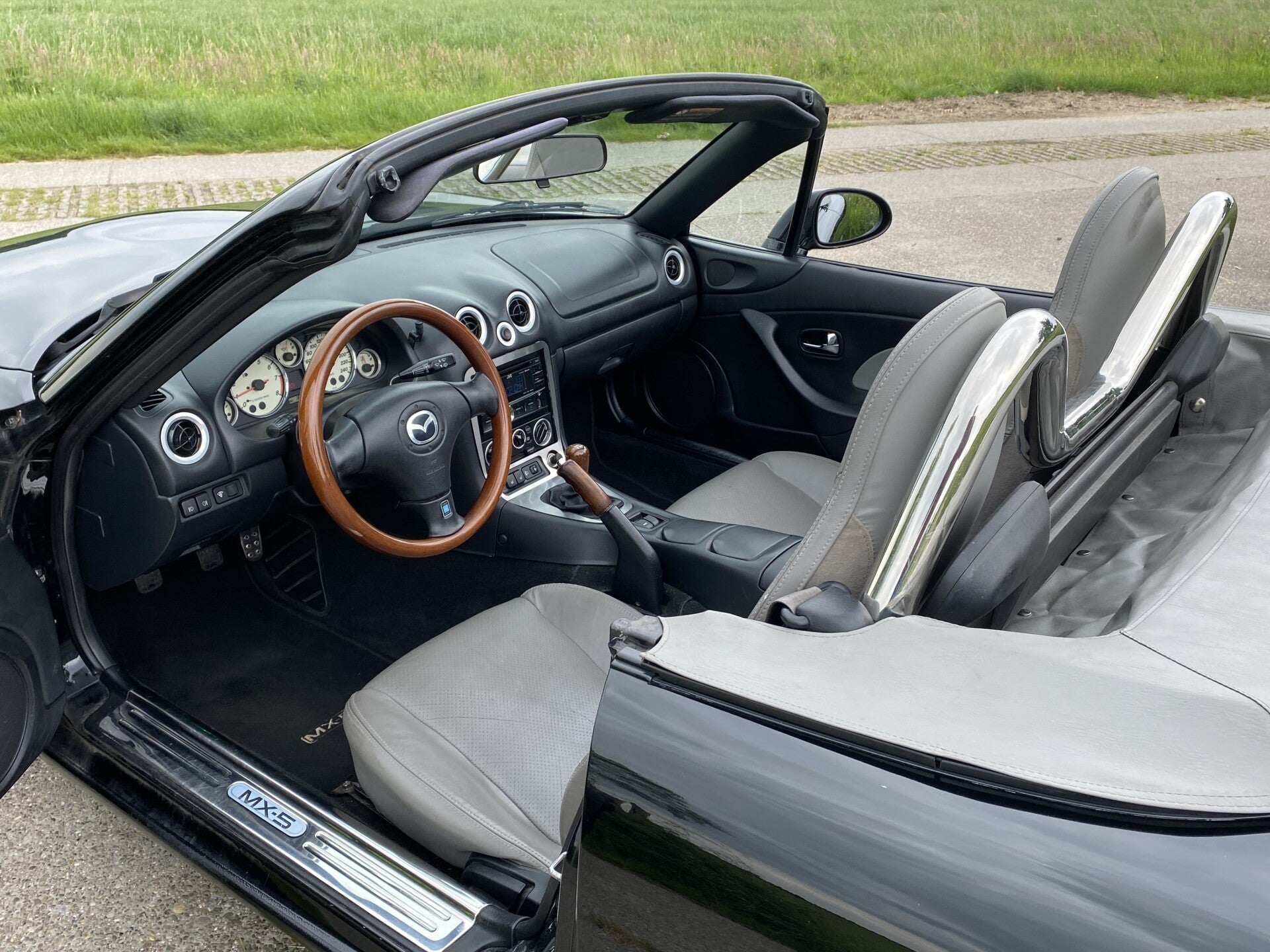 Een mooie Mazda MX5 NBFL 1.6 te koop. In 2001 kwam de facelift (FL) van de tweede generatie (NB) van de best verkochte roadster ter wereld. Deze MX5 is in mei 2003 voor het eerst geregistreerd in Duitsland en is in 2016 naar Nederland gehaald! De auto is uitgevoerd in een zwarte lak met lichtgrijs lederen stoelen. Dit in combinatie met de Nardi houtaccenten maakt het tot een mooie luxe uitvoering!